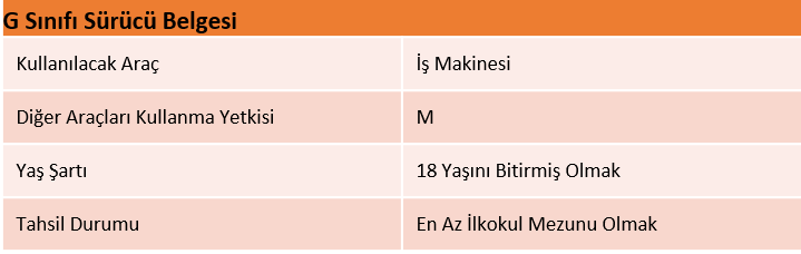 İş makinesi kullanımı için G sınıfı sürücü belgesi mevcuttur. Bu sınıfın kullanıma izin verdiği araçlar, yaş alt sınırları, yetkili olduğu diğer sınıflar, deneyim gerekliliği ile tahsil durumu ek olarak aşağıda listelenmiştir.